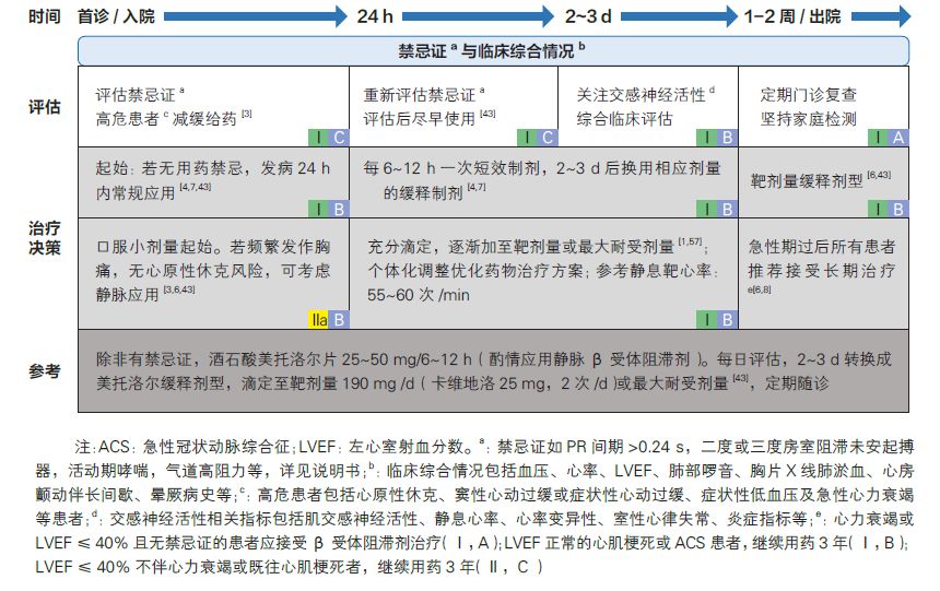 若无禁忌证,血流动力学稳定,应尽早(入院 24 h 内)应用 β 受体阻滞剂。